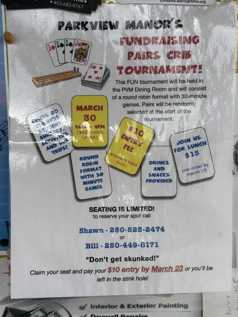 Parkview Manor’s Fundraising Round Robin Crib Tournament is on Monday, March 30th from 9 am to 4 pm. Entry is $10 per person, you have to register by March 23rd to attend. Round robin format with 30 minute games.