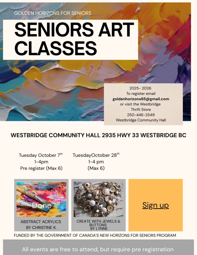 Tuesday, October 28th from 1 to 4 pm at the Westbridge Hall, Lynne is going to help us create with jewels & buttons. Free to attend, but pre registration is required. Drop by the Thrift Shop during open hours to register. Hosted by the Westbridge Recreation Society, funded through the New Horizon’s For Seniors Program.