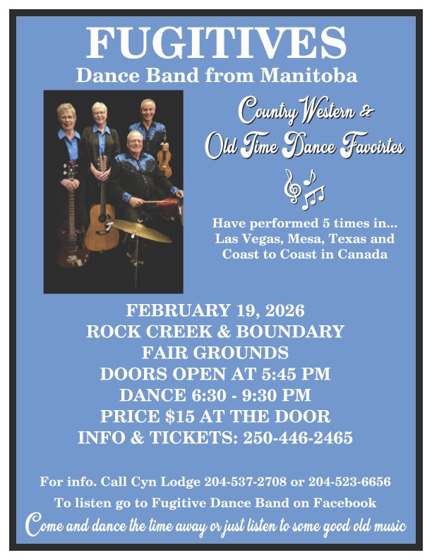 The Manitoba Fugitives Old Time Dance Band is playing at the fairgrounds on February 19th from 6-?pm. Fiddling tunes for two steps, polkas, schottisches, waltzes and other dances. They have played here many times before and always bring along a busload of friendly dancers willing to share their knowledge and expertise with those who wish to improve their steps and moves!