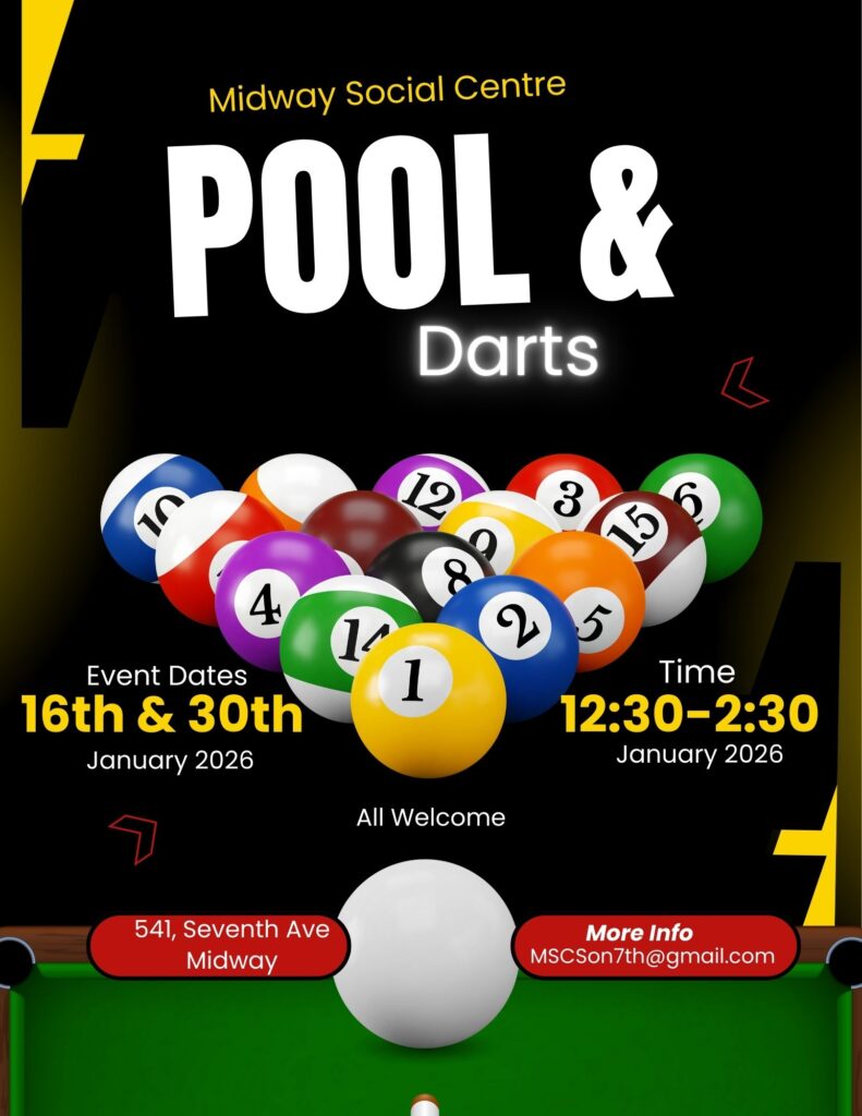 On Friday, January 16th and Friday January 30th, head to the Midway Social Centre to play pool, darts or shuffleboard from 12:30 pm to 2:30 pm!