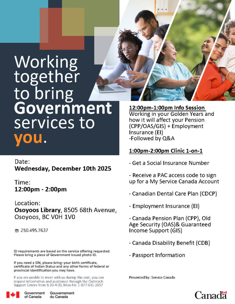 Service Canada information session and 1-on-1 clinic this Wednesday, Dec 10th 2025 at the Okanagan Regional Library – Osoyoos Branch.