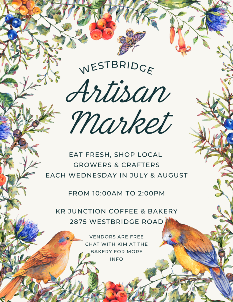 Wednesdays from 10 am to 2 pm in July and August in Westbridge at KR Junction Coffee & Bakery, come out and see what local artisans have to offer!
