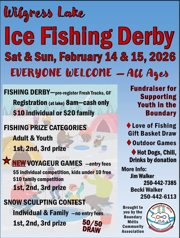 Sponsored by the Boundary Metis Community Association, the Wilgress Fishing Derby is happening all day on Saturday, February 14th and Sunday, February 15th. Lots of fun events, a snow sculpting contest, a 50/50 draw and much more. Registration is at 8 am sharp on Saturday, $10 per person or $20 per family.