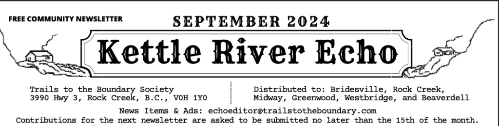 The September 2024 Kettle River Echo has lots of great articles, puzzles and announcements this month. Congratulations to Tammy Battersby on receiving the King Charles Coronation medal! The Trans Canada Art Showcase is on now and you can see some local art showcasing the KVR/Trans Canada Trail at Riverside Centre now until the first week of October. The Greenwood/Phoenix Tramway Bore and Hartford Junction story by Vic Boychuk is another interesting historical read. The latest schedule for the Seniors Being Seen program as well as much more. Thanks to our hardworking volunteers for the great work!