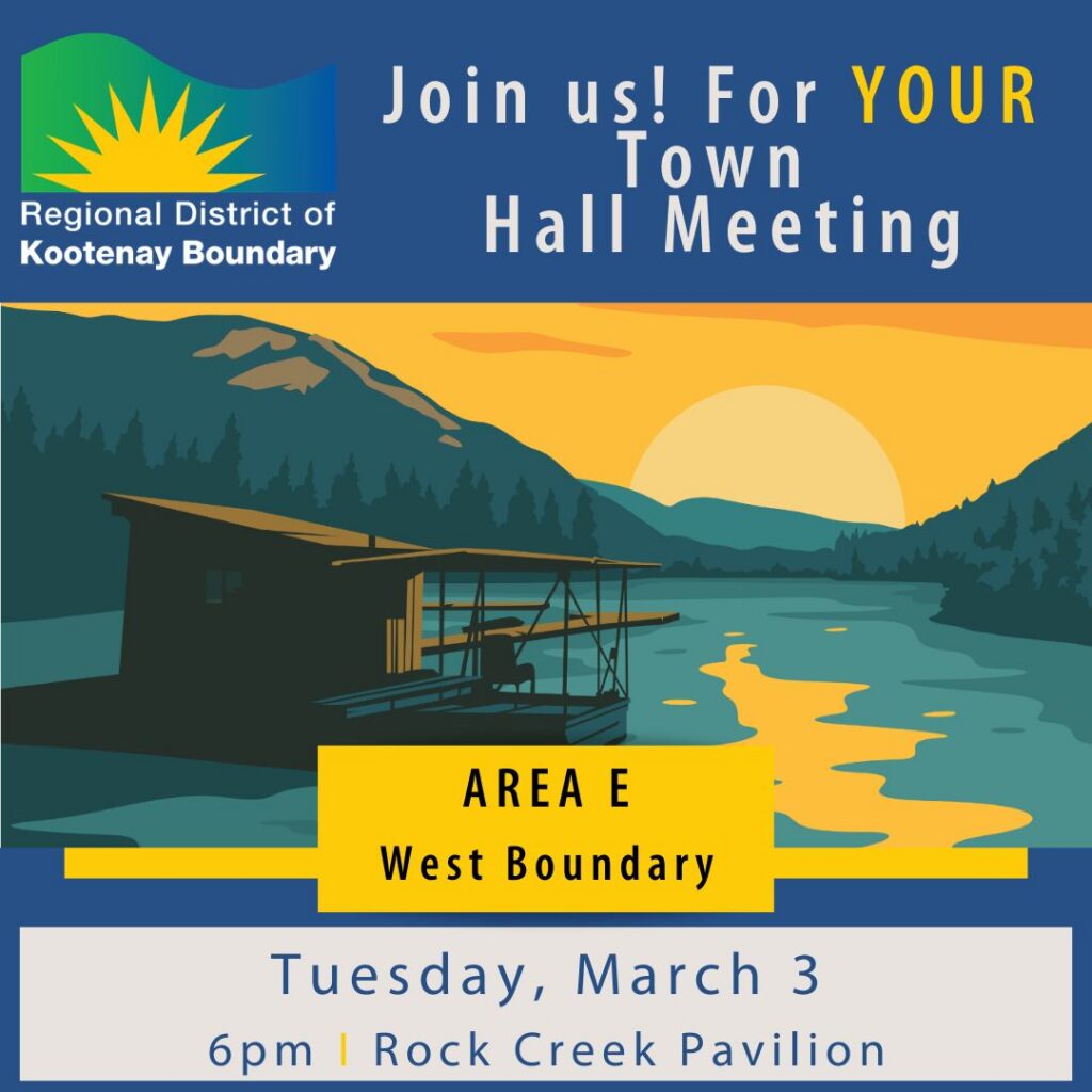 The RDKB’s Area E/West Boundary Town Hall Meeting will take place at the Rock Creek Pavilion, on Tuesday, March 3 at 6pm.